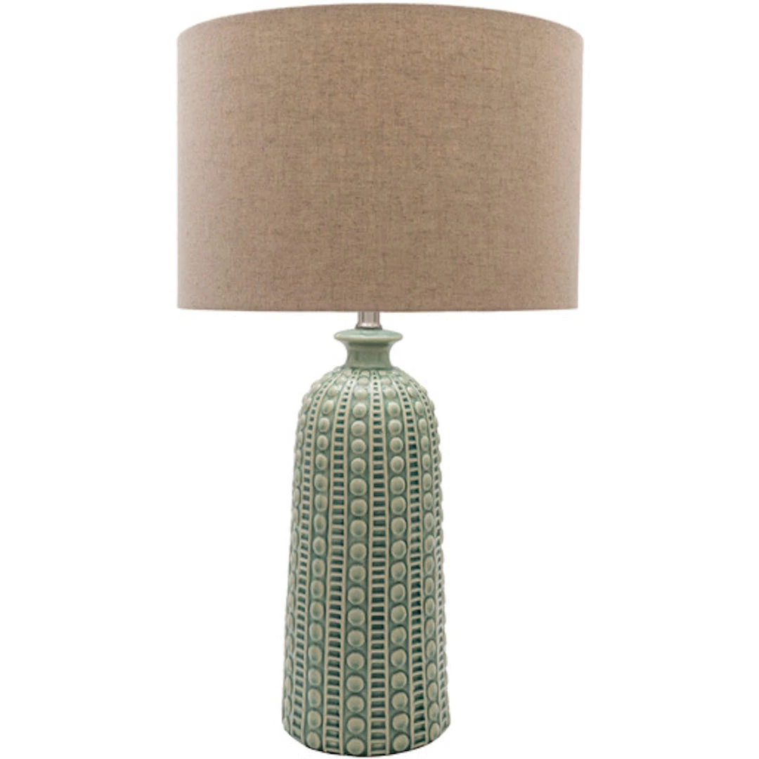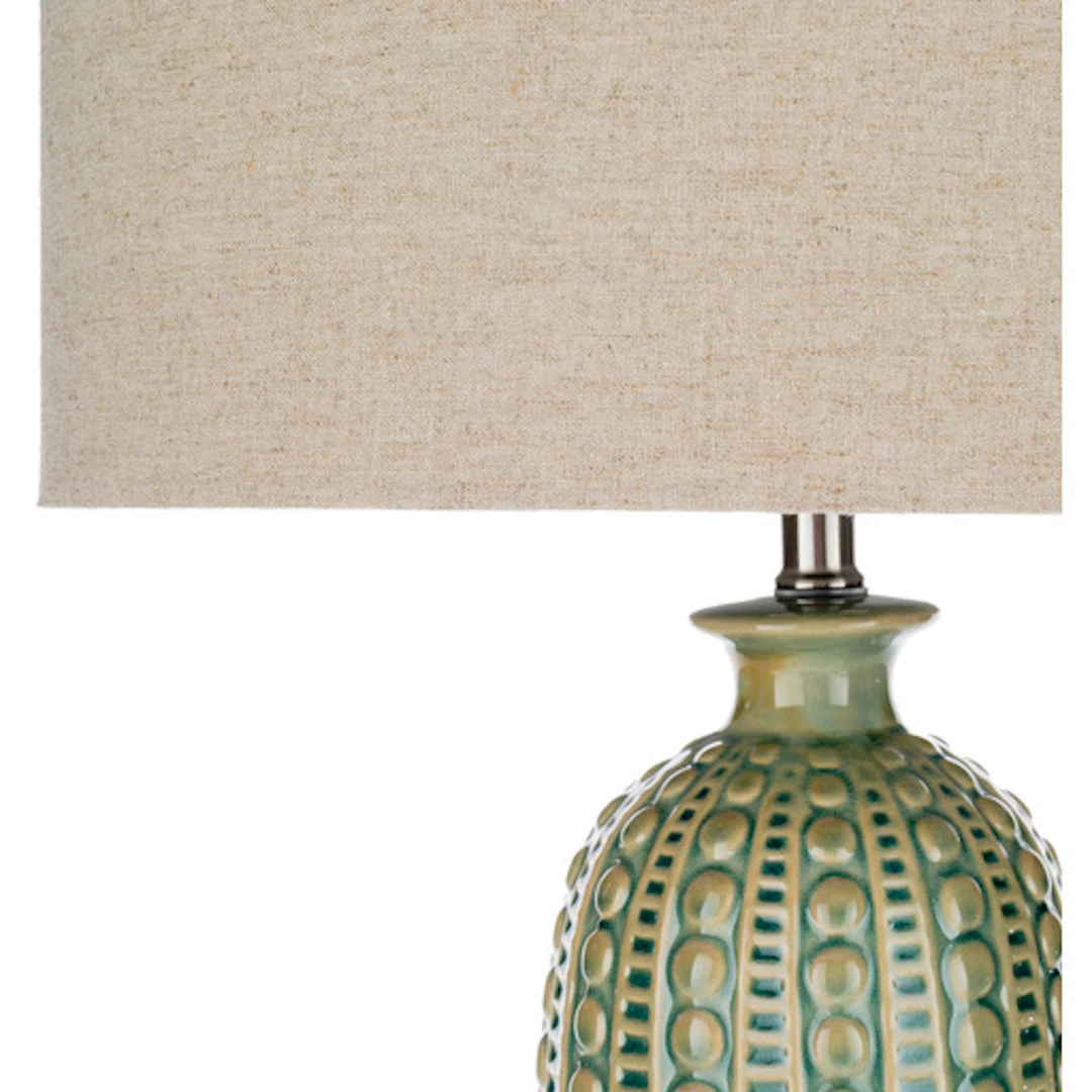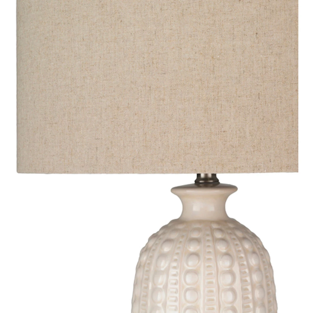 Table Lamp, White Glazed Ceramic Body, Camel Linen Shade