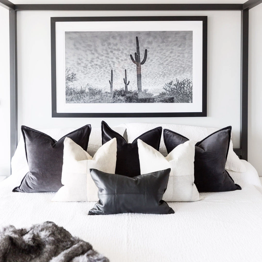 The Launch Pillow is a black pillow made of 50% leather and 50% polyester in the front and 100% polyester in the back. It has a knife edge look and is the perfect chic look to add to your bed, couch, etc.