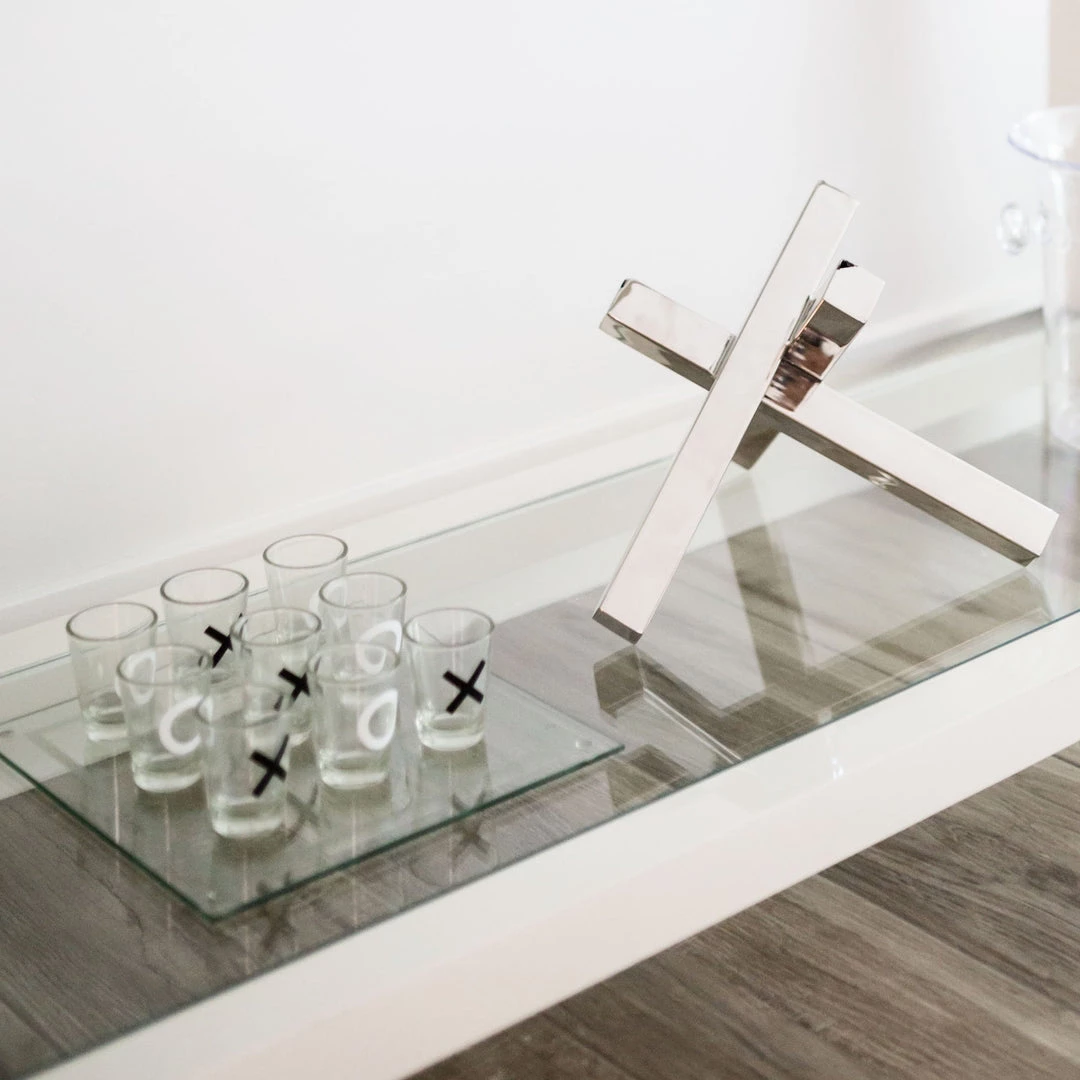 The stakes just got higher and Tic Tac Toe just got fun. Tic Tac Shot!™ transforms the classic boredom buster into a risky grown-up game of skill. Made of glass and hand wash recommended. Game includes 1 board and 9 shot glasses.