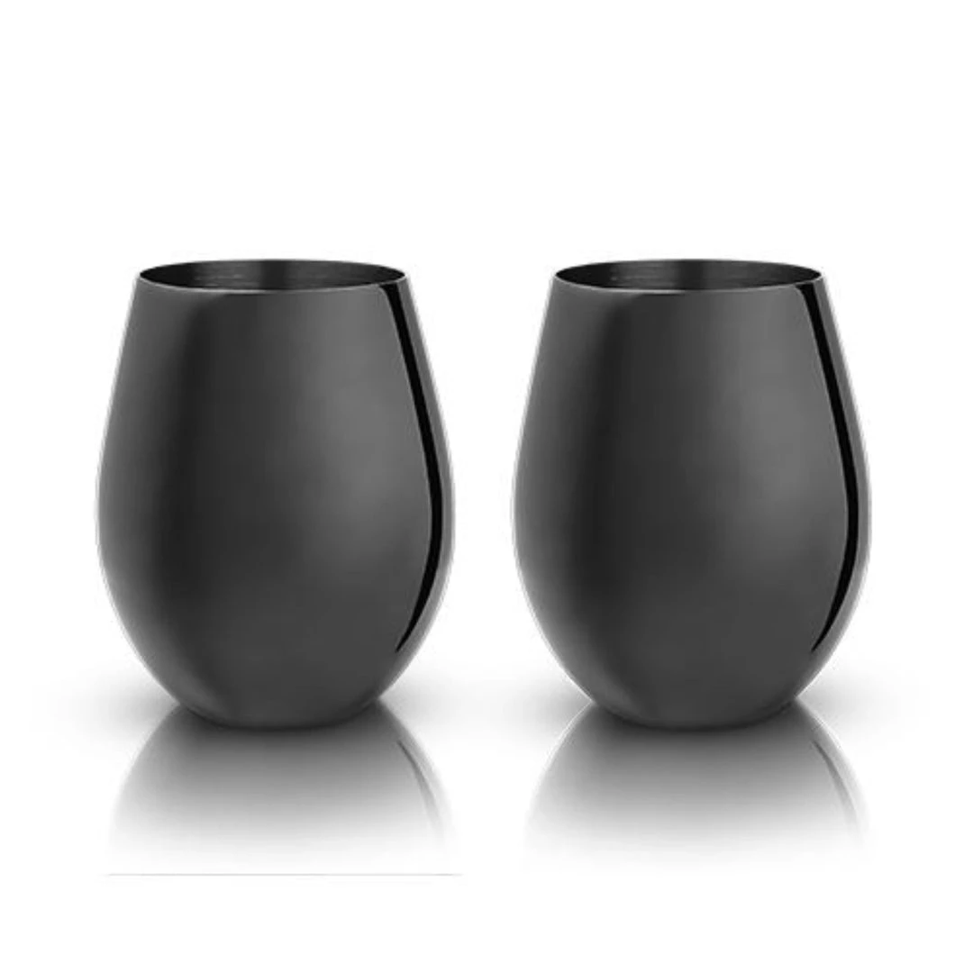 Savor Sauvignon Blanc and Chardonnay from an eye-catching pair of stemless tumblers, polished and perfectly rounded to fit the curve of your palm. These gunmetal-black-plated metal glasses collect and intensify the aromas of your drink, allowing you to fully appreciate its bouquet.