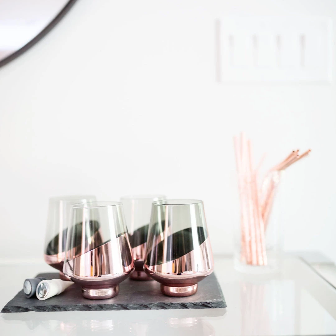 Polished copper curves diagonally across the smooth surfaces of this wine glass duo, adding a vestige of metallic intrigue to an already elevated set of glassware. Fashioned from lead-free colored crystal, each tumbler accommodates 16 oz. – making them exquisite containers for your favorite, carefully selected vintage.  Tinted Lead free crystal