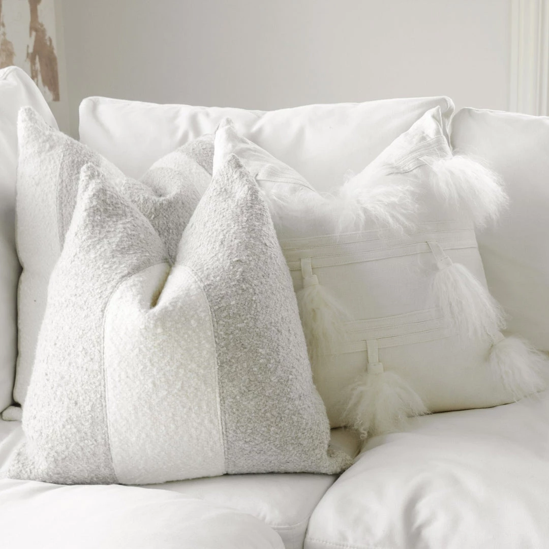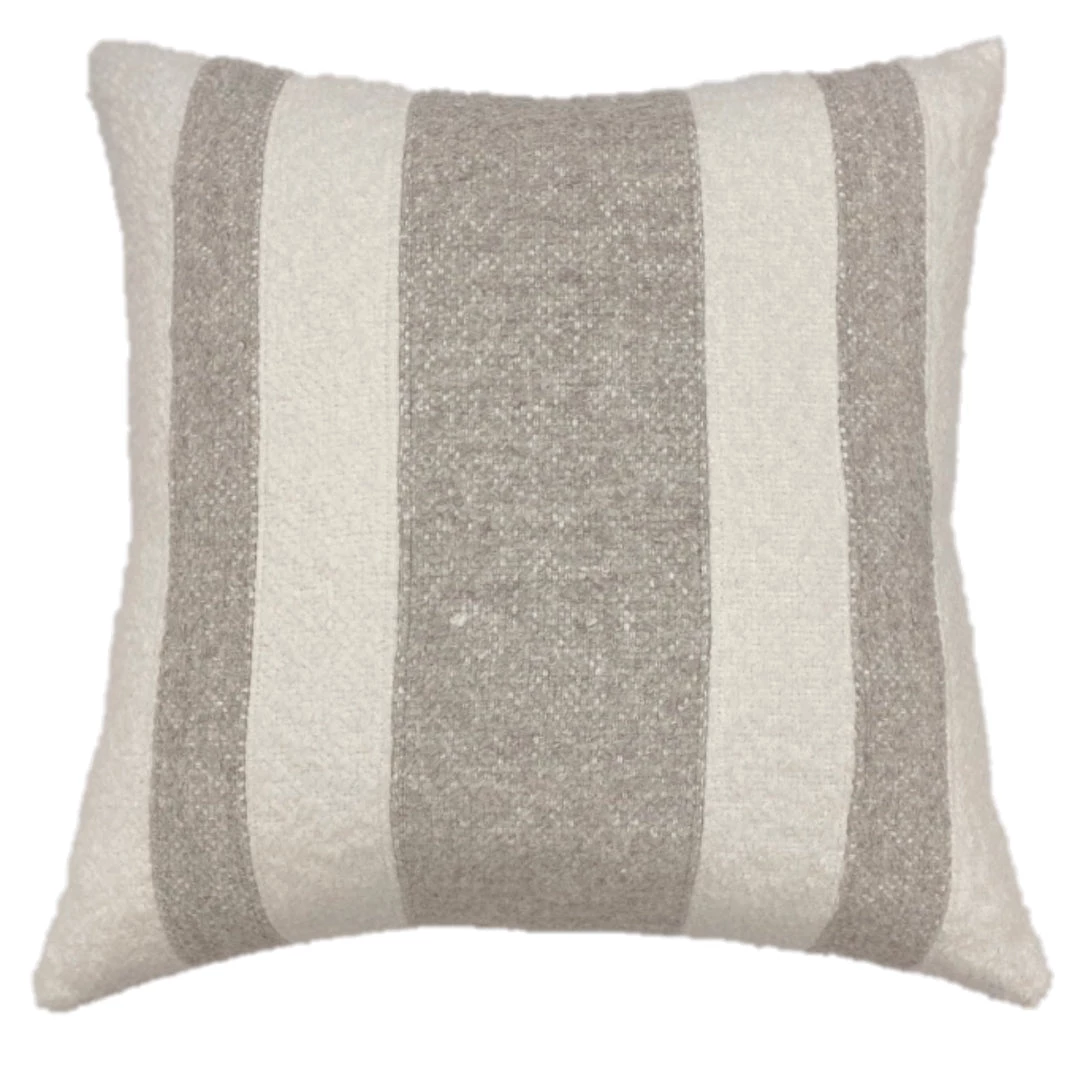 The London Three Stripe Pillow can add a cozy contrasted appeal to your space. With a timeless grey and cream boucle texture, it is the trow you will want to snuggle next to for years to come. This pillow is filled with a high-quality down insert for maximum comfort and shape. The cover can be removed for cleaning by a concealed zipper. (Other London Pillow collection options can be sold seperately)