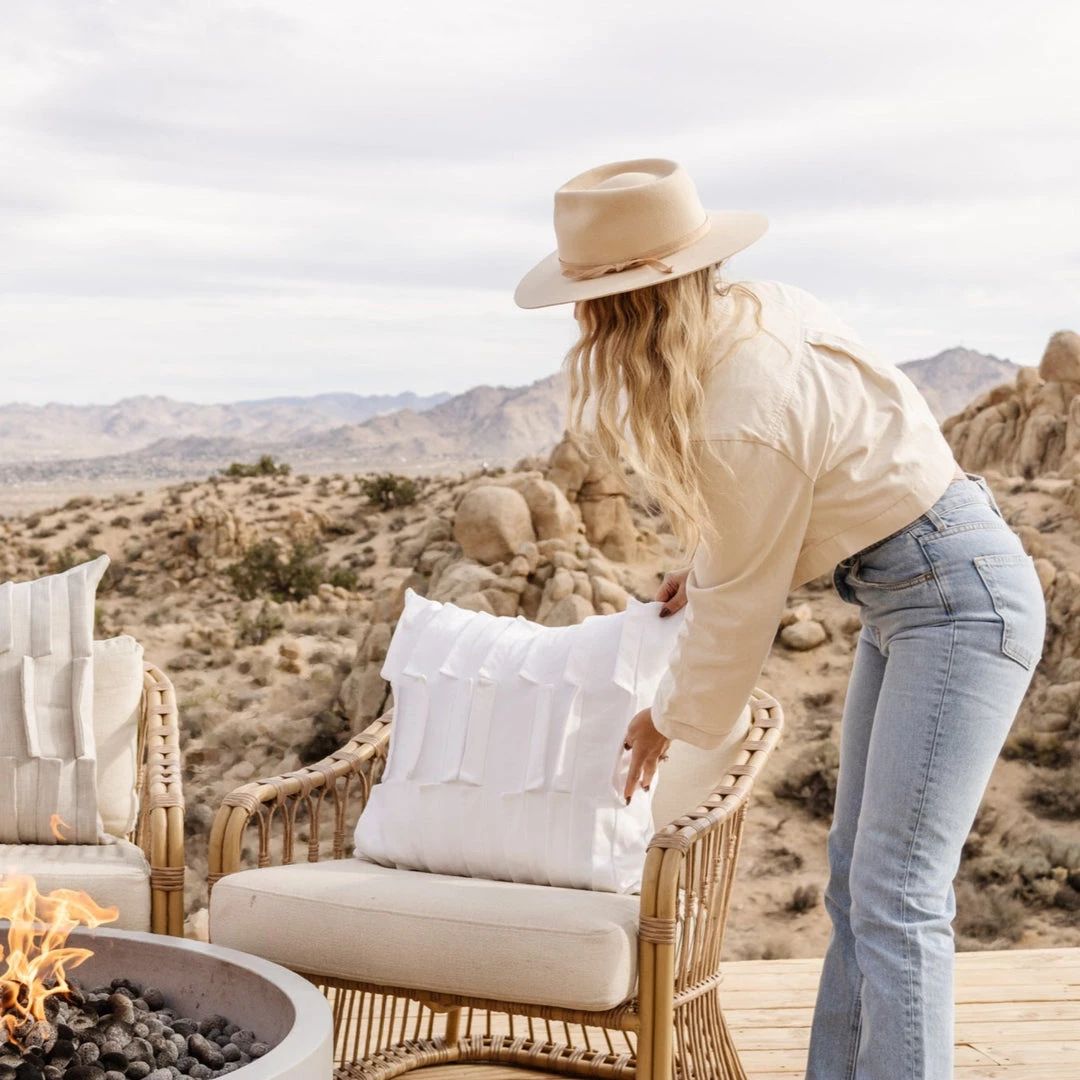 This decorative pillow in oyster will add a casual vibe to your indoor/outdoor lounges. With a pulled interactive pattern, this textured throw will be the main talk of the “she-shed”. Filled with an outdoor-friendly foam to withstand weather and maximize outdoor comfort.Â