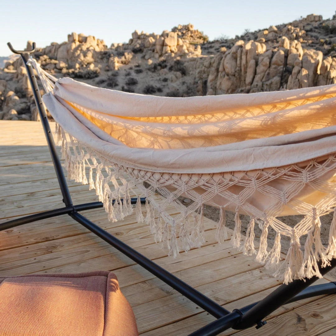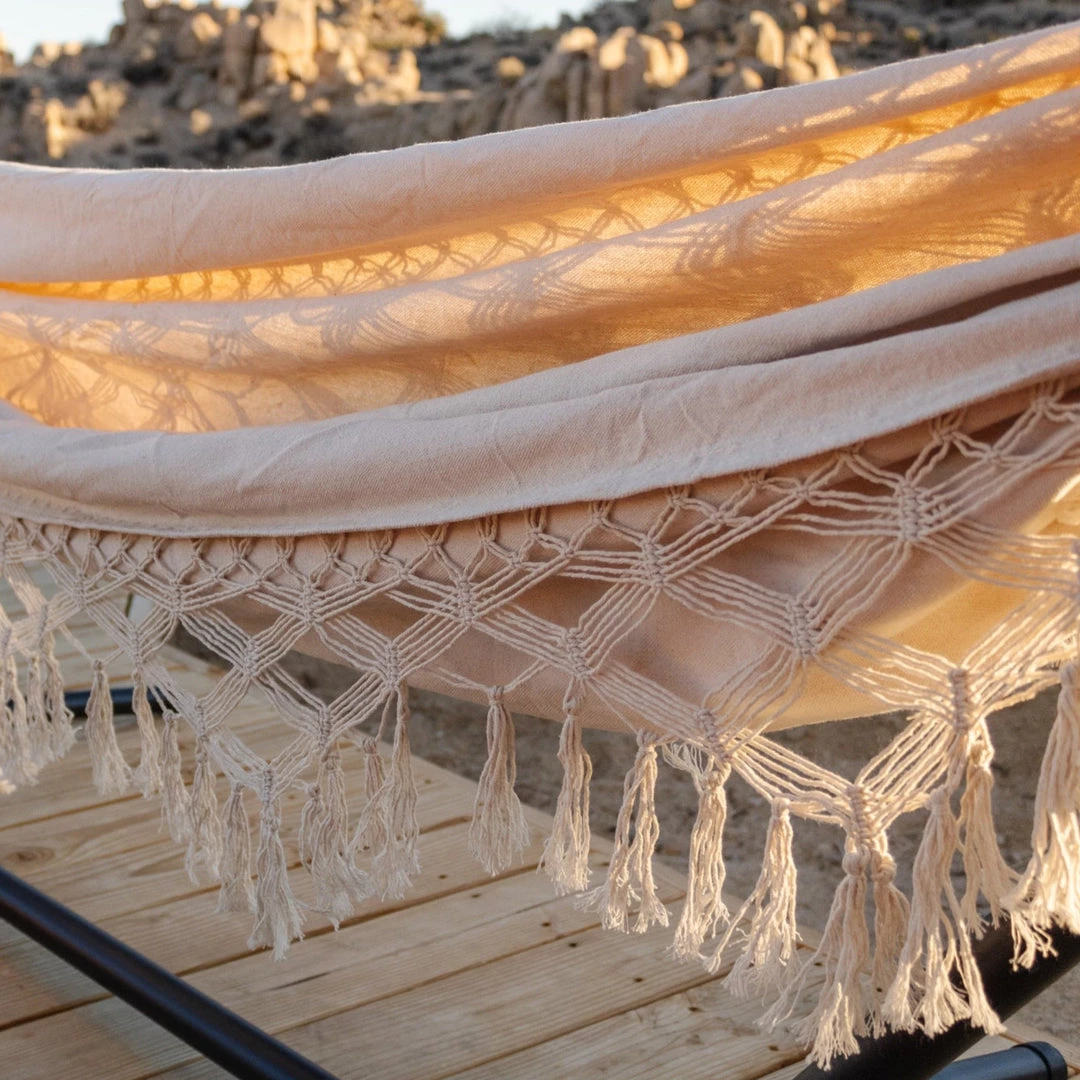 Kick it between the trees with this macrame hammock. Whether you find yourself in a tropical oasis, or in the comfort of your backyard, this hanging lounger will bring you to the ultimate relaxation mode.