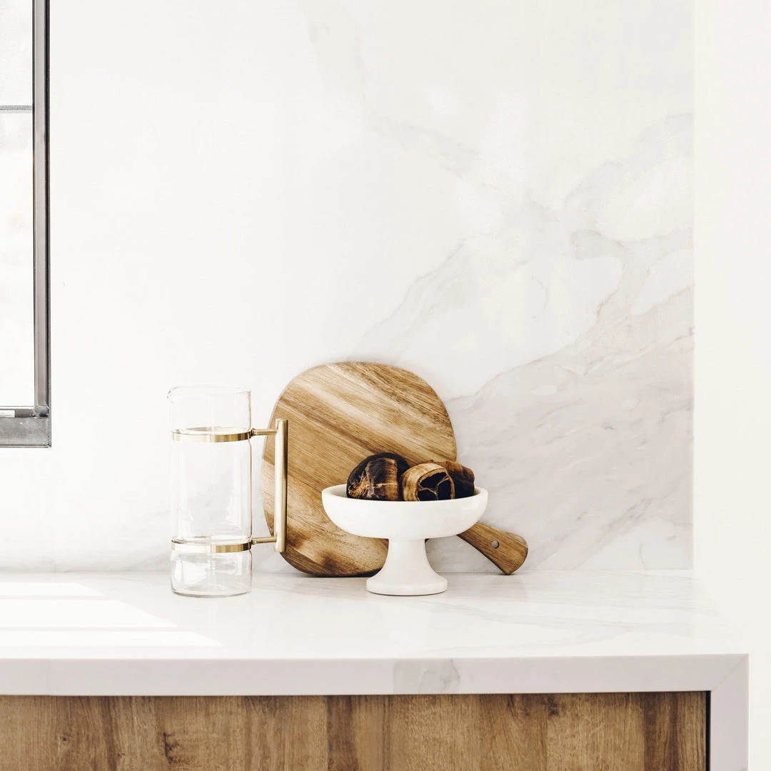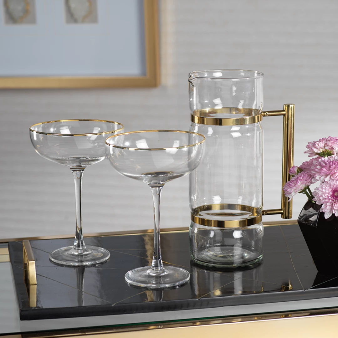 This brass-trimmed pitcher with sleek lines helps elevate your bar area with a modern sophisticated look.